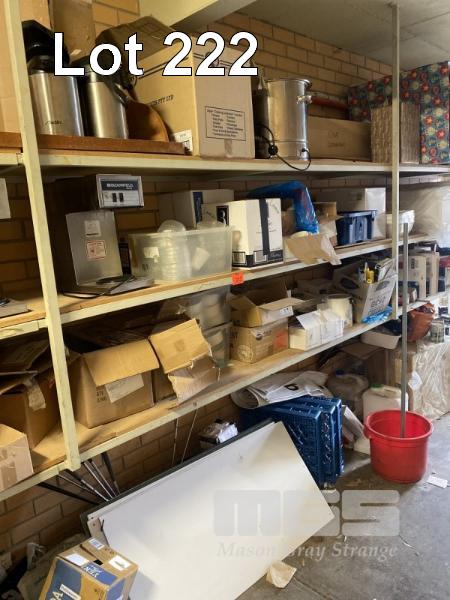 4 x SHELVES OF ASSORTED BASEMENT TREASURES, GLASS WARE, COFFEE MACHINES, COFFEE CUPS, 2 x THERMOS, PAINT SUPPLIES, HOT WATER DISPENSER ETC.