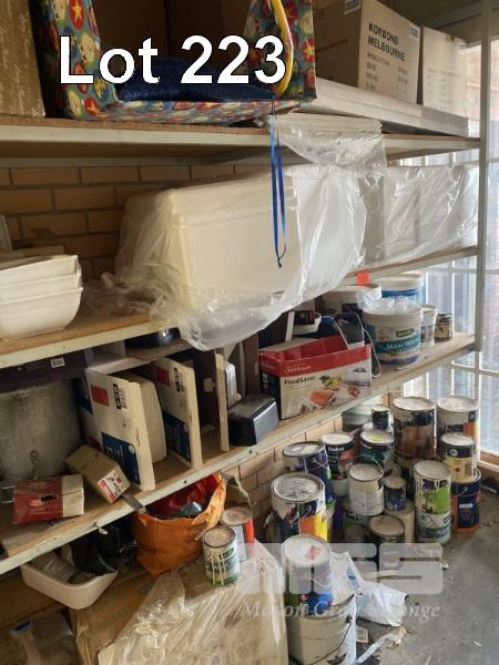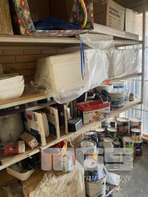 4 x SHELVES OF ASSORTED BASEMENT TREASURES, ASSORTED CANTS OF PAINT, STAINLESS STEEL POTS, TAKE AWAY CONTAINERS, KITCHEN SUPPLIES ETC.