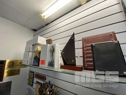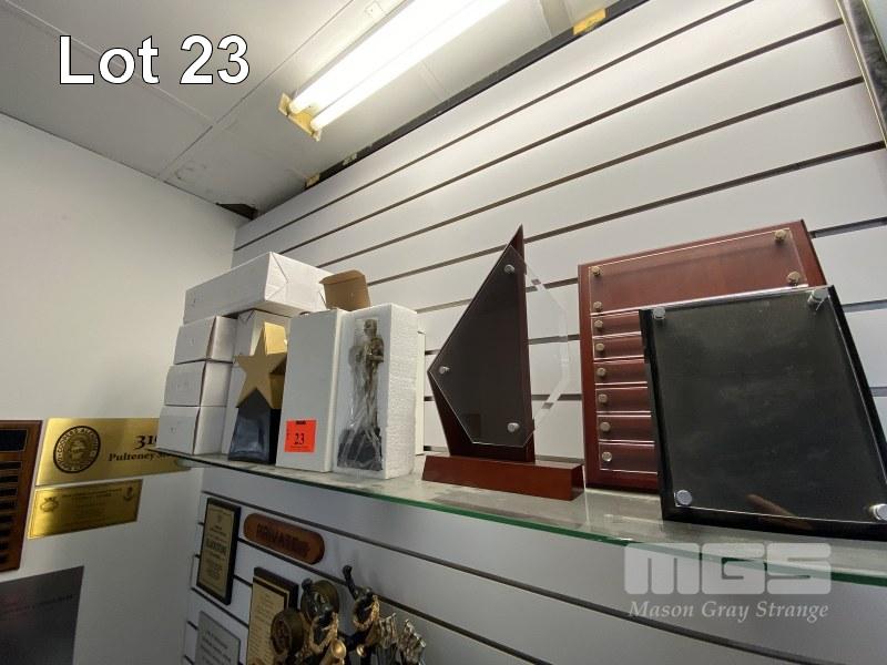 16 x ASSORTED TROPHYS, STATUES, STARS, PLAQUES, CONTENTS OF 1 SHELF