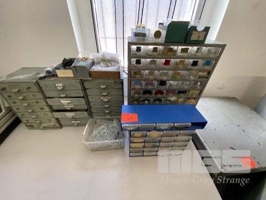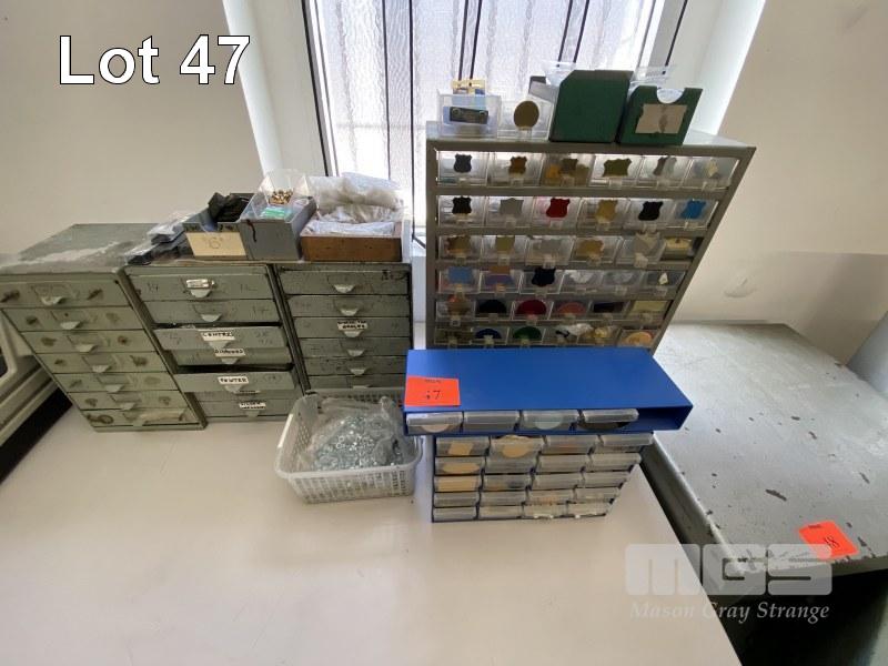 LARGE QUANTITY OF ENGRAVING HARDWARE, INCLUDES TROPHY LABELS & BADGES, WITH MULTI DRAW STORAGE UNIT
