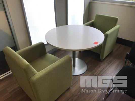 VISITORS SETTING, 3 PIECE, CIRCULAR TABLE, WHITE LAMINATE WITH CHROME SINGLE PEDESTAL BASE PAIR OF GREEN FABRIC UPHOLSTERED ARMCHAIRS