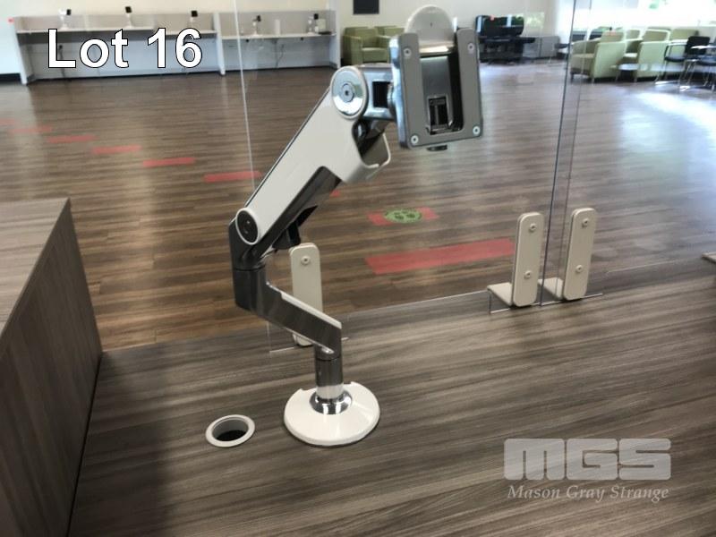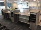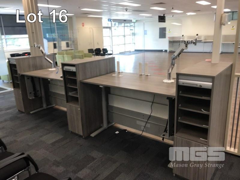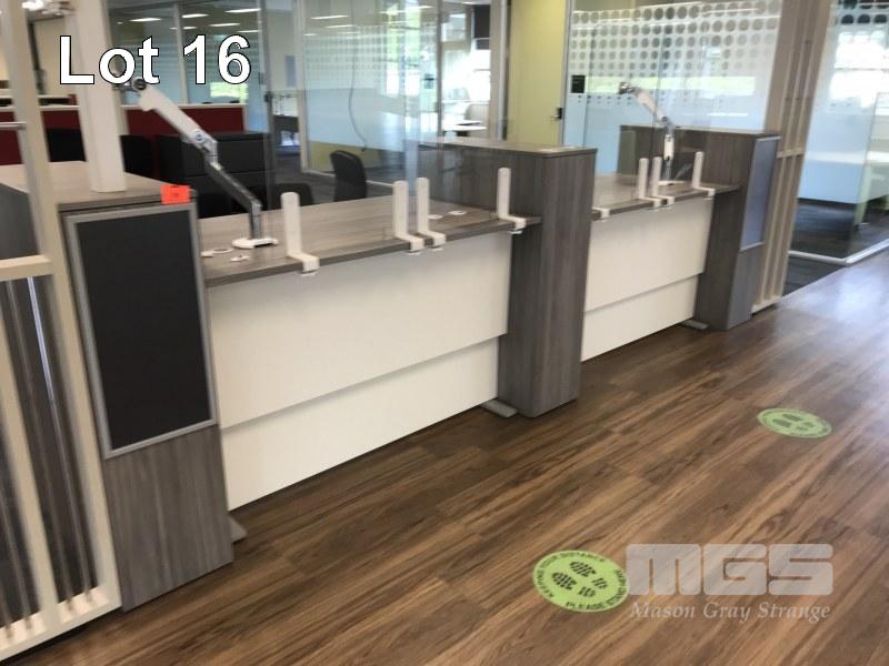 RECEPTION COUNTER, 2 PERSON, SCHIAVELLO, WITH ELECTRIC ERGONOMIC DESKS, 3 X DOCUMENT COMPARTMENTS & DRAWERS, MONITOR ARMS, CPU BRACKETS & PERSPEX SCREENS