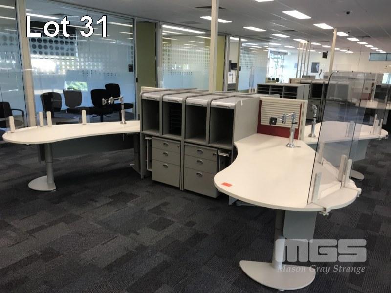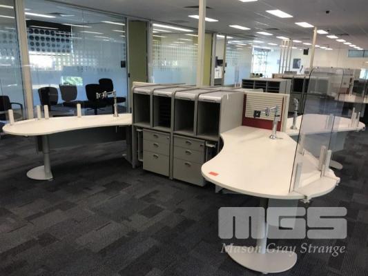 4 PERSON WORKSTATION, SCHIAVELLO, WITH ERGONOMIC DESKS, DOCUMENT COMPARTMENT, DUAL MONITOR ARM, CPU BRACKET, PERSPEX SCREEN, PRIVACY PARTITIONS & UNDERDESK MOBILE