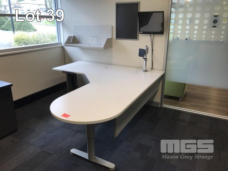 CORNER OFFICE DESK, WHITE LAMINATE, ERGONOMIC WITH MONITOR ARM WALL MOUNT DOCUMENT SHELF, PERSPEX WALL MOUNT NOTICE BOARD & WALL MOUNT SAMSUNG MONITOR