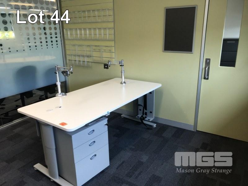 OFFICE DESK, WHITE LAMINATE, ERGONOMIC WITH 2 X MONITOR ARMS, UNDERDESK MOBILE, PERSPEX WALL MOUNT NOTICE BOARD & SLATWALL PAMPHLET HOLDER