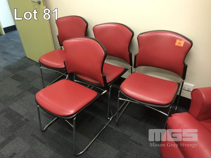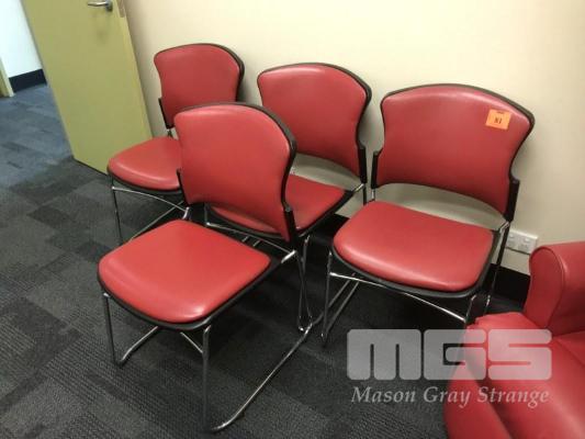 SET OF 4 RED VINYL UPHOLSTERED VISITORS CHAIRS WITH INTERLOCKING FITTINGS TO BASE