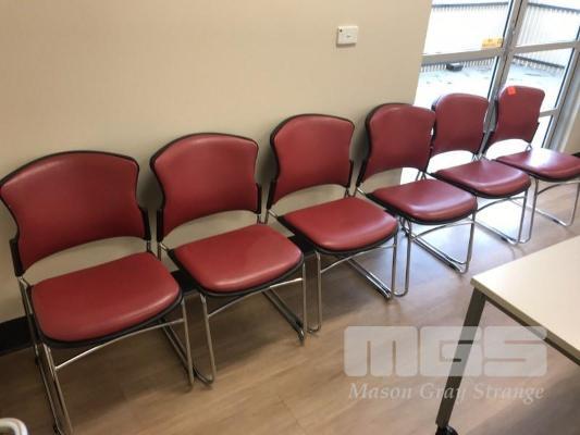 SET OF 6 RED VINYL UPHOLSTERED VISITORS CHAIRS WITH INTERLOCKING FITTINGS TO BASE