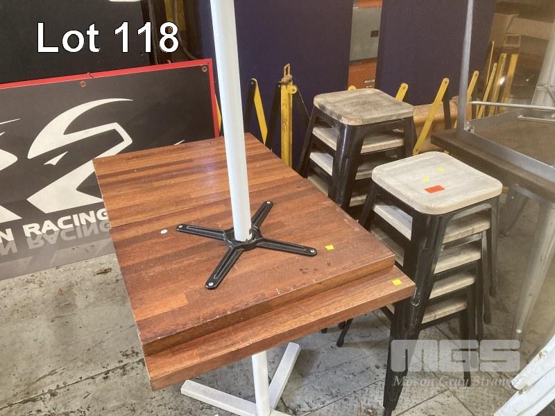 11 x LOWLINE STOOLS, METAL FRAME, TIMBER SEAT & 3 SOLID TIMBER TOP TABLES