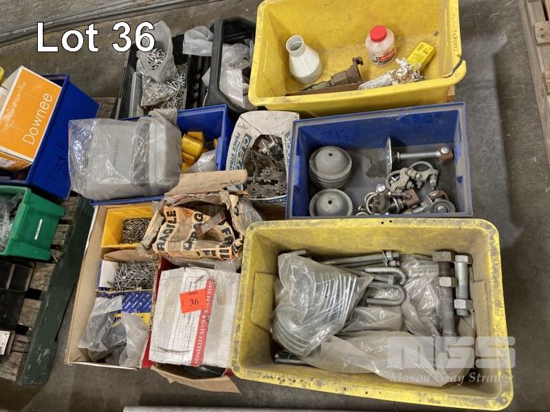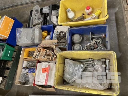 CONTENTS OF PALLET ASSORTED NAILS, TEK SCREWS, GALV BOLTS, PACKING PLATES, HANDRAIL BASES ETC.