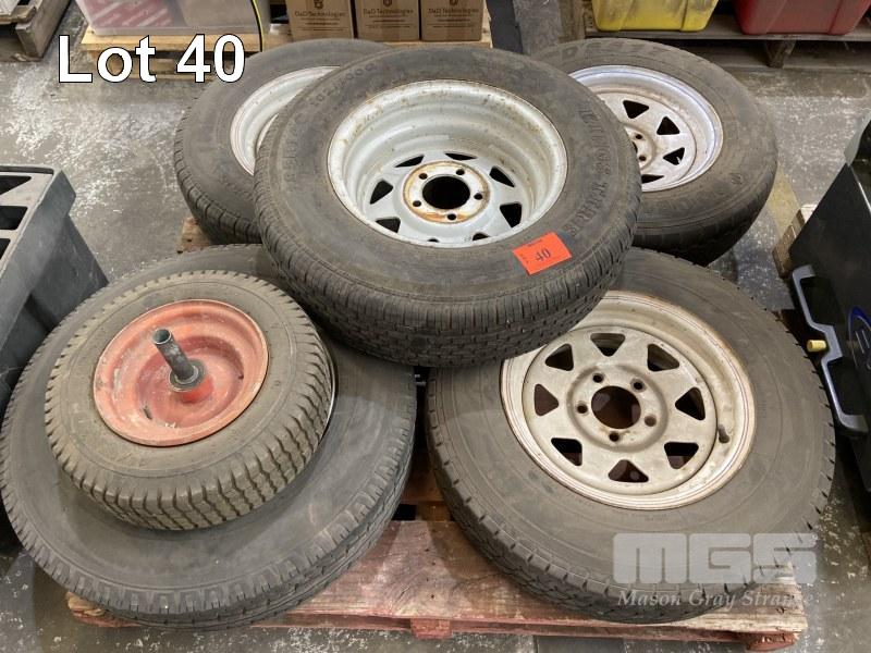 4 x 5 STUD STEEL RIMS, 185/14 1 x WHEELBARROW TIRE 1 x 5 STUD RIM