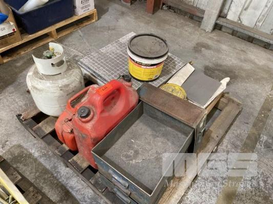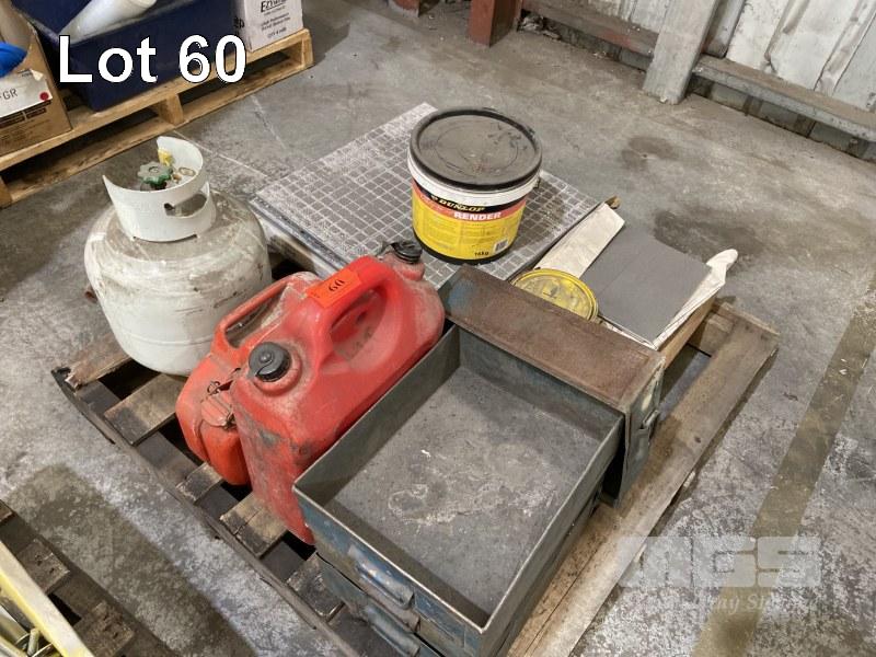20L & 10L RED FUEL CANS, 14L GAS BOTTLE, ASSORTED TILE & RENDER