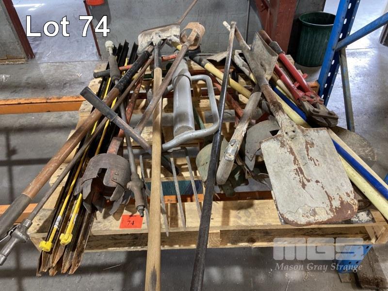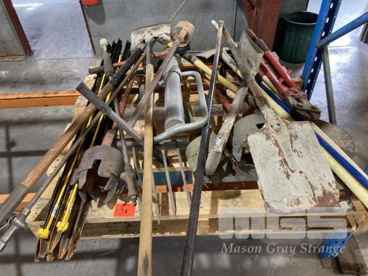 CONTENTS OF PALLET LANDSCAPING TOOLS, STAR DROPPERS, SHOVELS, POST HOLE DIGGERS ETC.