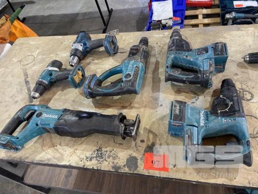 ASSORTED MAKITA TEK GUNS, HAMMER DRILLS, RECIPRO SAWS, CHARGER, CARRY BAG, NO BATTERIES