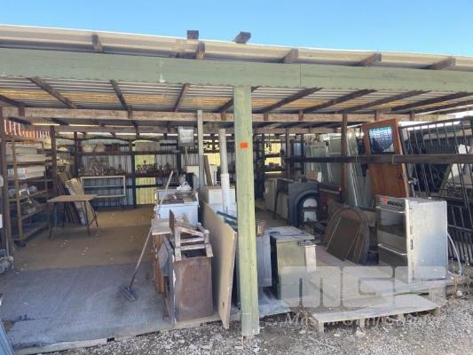 TIMBER LEAN TO, HARDWOOD POSTS, 10 x 10m APPROX, IRON ROOF WITH SKYLIGHTS