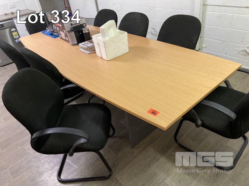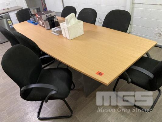 BOARDROOM TABLE, CURVED SIDED, 3000mm, BEECH/STORM LAMINAE & 8 x SWING BACK OFFICE ARM CHAIRS