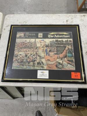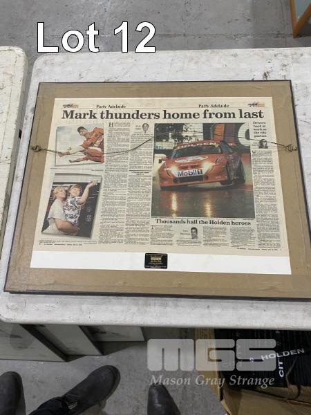 GLAZED ADVERTISER ARTICLE, "MARK OF A CHAMPION" & "MARK THUNDERS HOME FROM LAST" (FRONT & BACK), 2000 CLIPSAL 500 ADELAIDE, SIGNED BY MARK SKAIFE