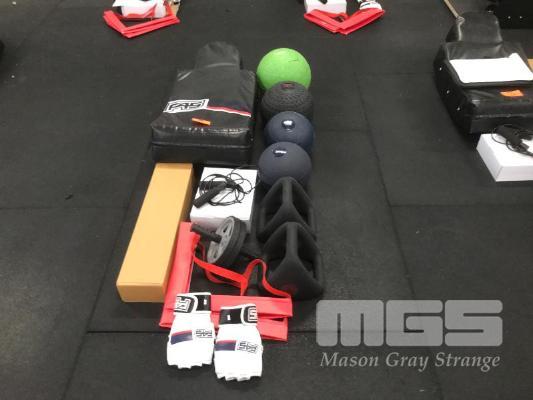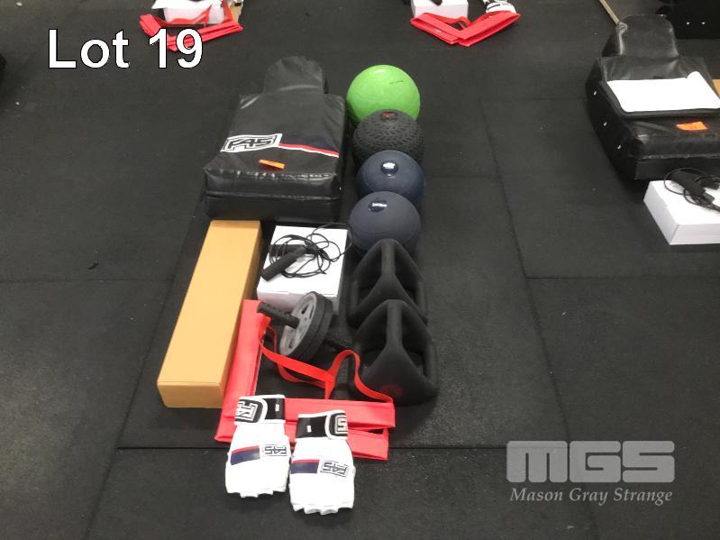 PADDED MMA SHIELD & GLOVES, 2 X Y-BELLS, LARGE, 4 X SLAM & MEDICINE BALLS 30kg, 12kg, 6kg & 3kg, EXTENSION BAND & KIT WITH HANDLES, AB ROLLER, AGILITY SQUARE & SKIPPING ROPE
