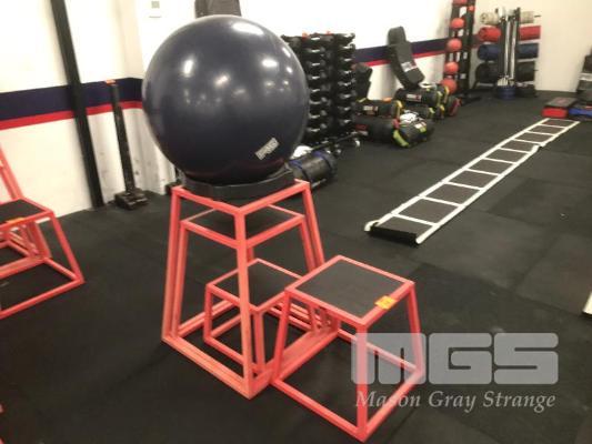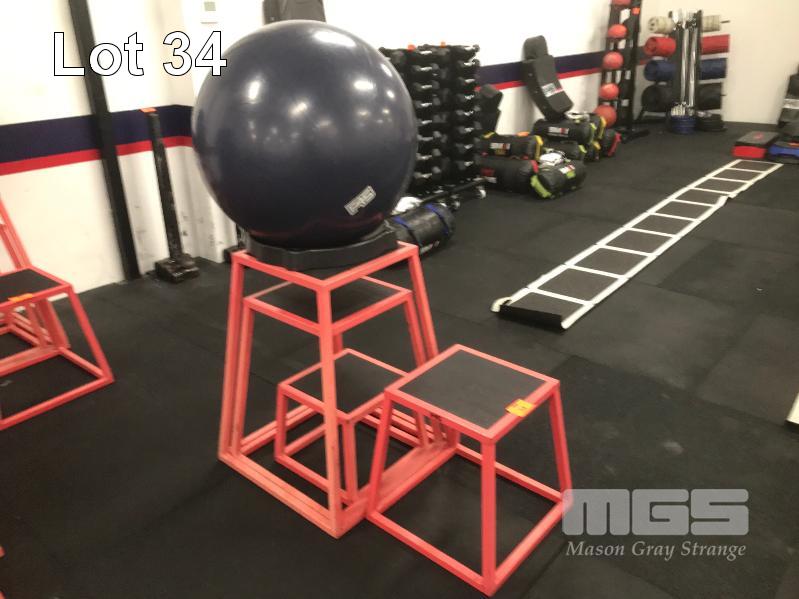 AGILITY BOXES, NEST OF 4 GRADUATED, STEEL FRAMED, RUBBER TOPPED, WITH SWISS BALL & STAND