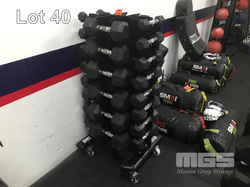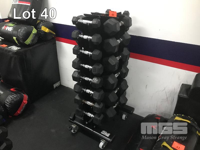 DUMBBELL SET ON MOBILE STAND, PAIRS 1-10kg IN 1kg INCREMENTS & PAIRS OF 12.5kg, 15kg, 17.5kg & 20kg