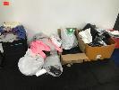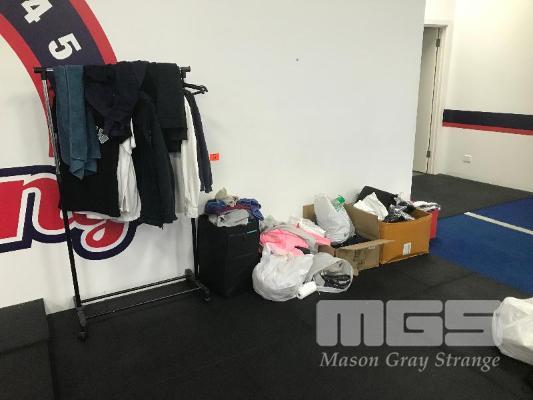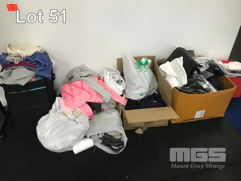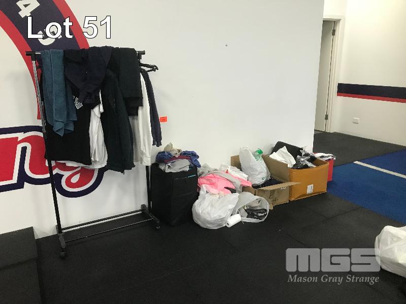 ASSORTED F45 CLOTHING MERCHANDISE, USED GLOVE INSERTS, LOST PROPERTY CLOTHING, TOWELS & CLOTHES RACK