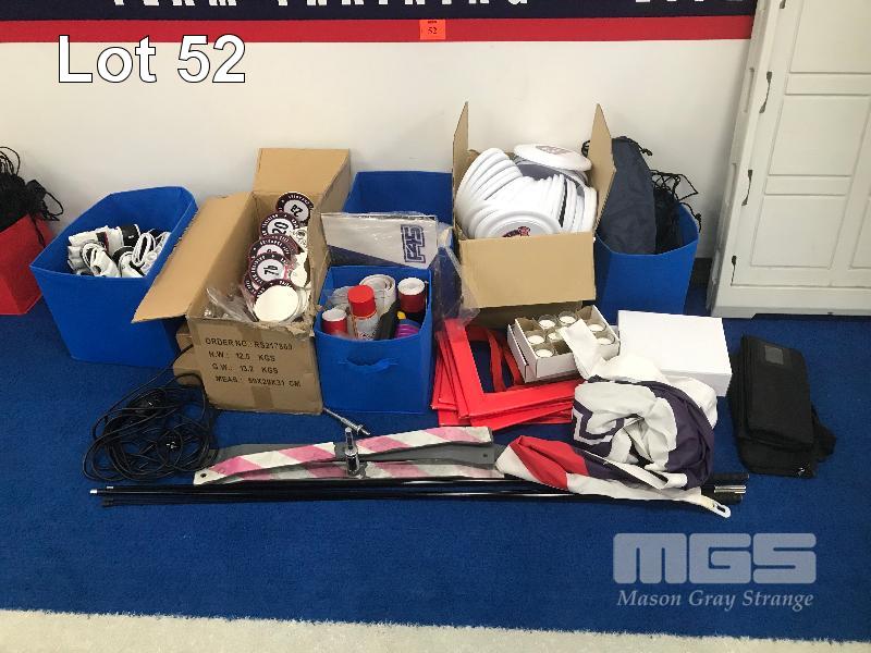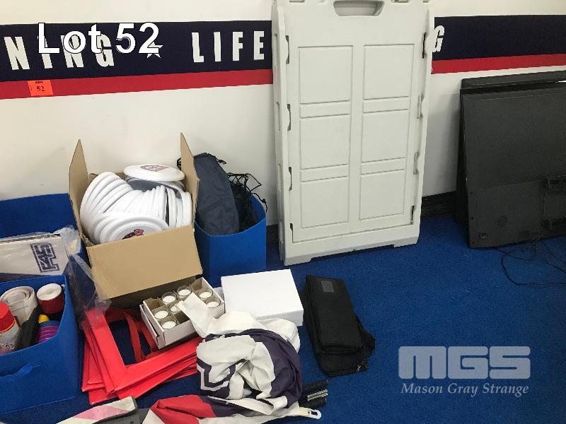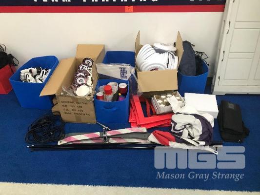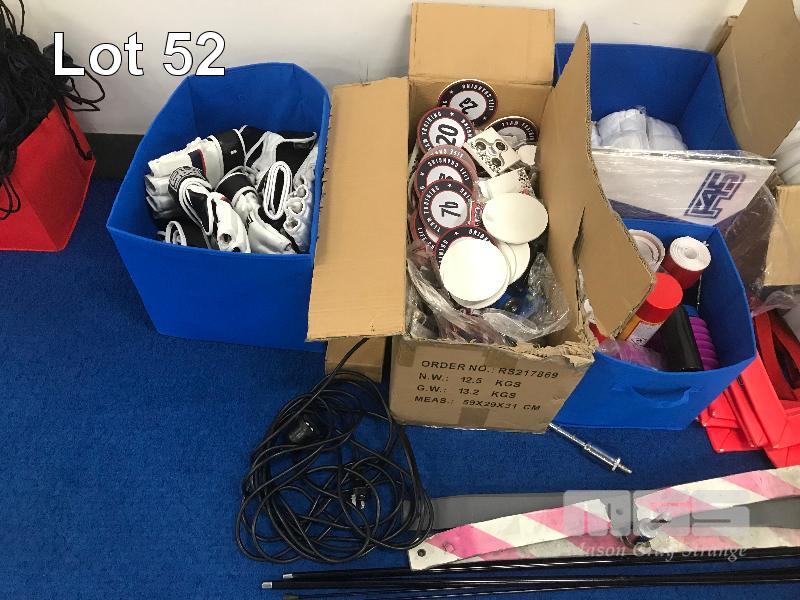 ASSORTED F45 MERCHANDISE, NEW GLOVE INSERTS, 2 X TEAR DROP FLAG SETS, FRIZBEE'S CANDLES, KEYRINGS, AGILITY SQUARES, MMA GLOVES, BLOW MOULD A-FRAME SIGN & MORE