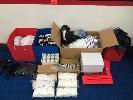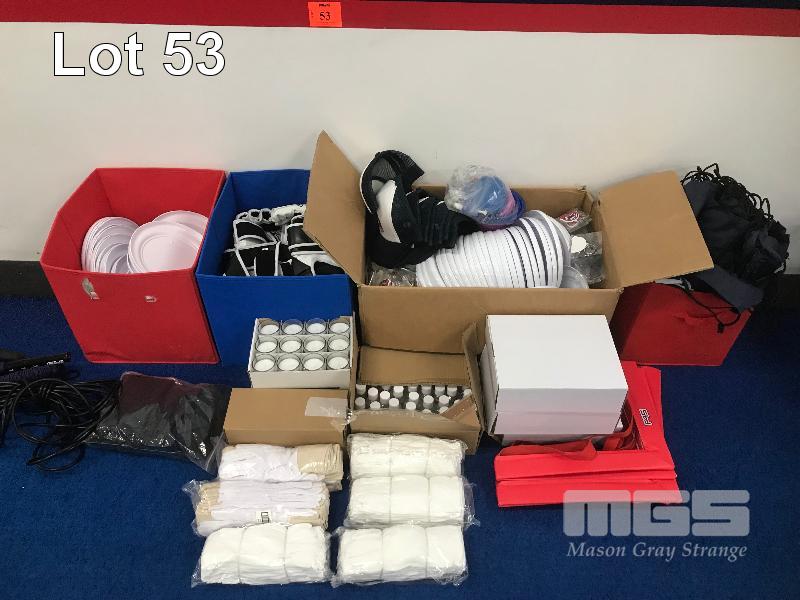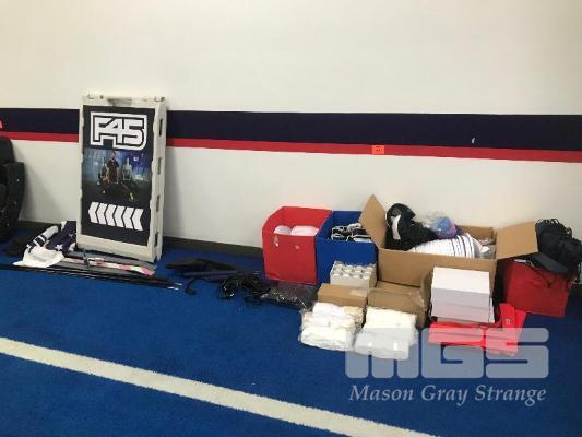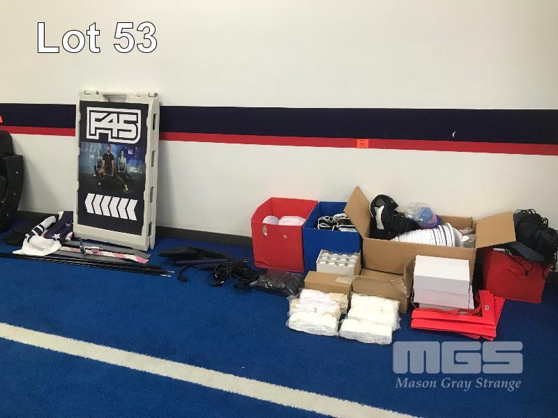 ASSORTED F45 MERCHANDISE, NEW GLOVE INSERTS, 2 X TEAR DROP FLAG SETS, FRIZBEE'S CANDLES, KEYRINGS, AGILITY SQUARES, MMA GLOVES, BLOW MOULD A-FRAME SIGN & MORE