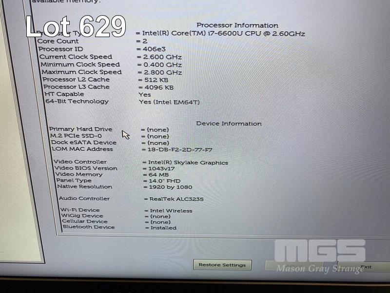 LAPTOP, DELL LATITUDE E7470, CORE i7 6600U (6TH GEN) @ 2.6GHz, 8GB DDR4 RAM, NO HDD, 14" WIDESCREEN (NO POWER SUPPLY) (NOTE: NO BATTERY, MISSING ARROW KEY) S/N:9QJWBG2