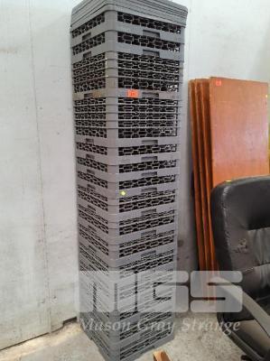 15 X NSF CERTIFIED 25-COMPARTMENT DISHWASHER GLASS TRAYS WITH EXTENDERS. IN GREY. 7 X LIDS. 500 X 500 MM.