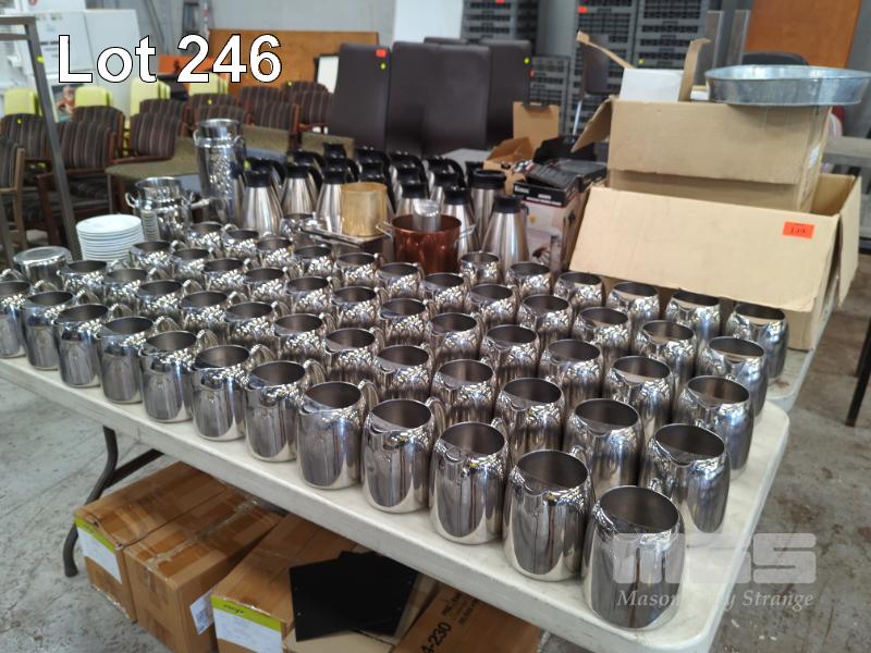 HOTEL BREAKFAST SERVICE. INCLUDES 60 (APPROX.) X HYPERLUX MILK/WATER JUGS, 20 (APPROX.) KINOX AROMIS INSULATED THERMAL SERVERS (NO LIDS), URNS, STRAW DISPENSER ETC (2 X TABLES).