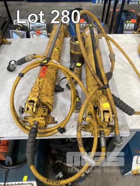 2 x ENERPAC HYDRAULIC HAND PUMPS, 750mm (L) WITH HOSES & 3 x HYDRAULIC RAMS
