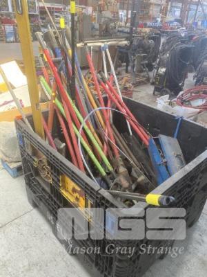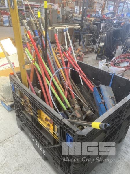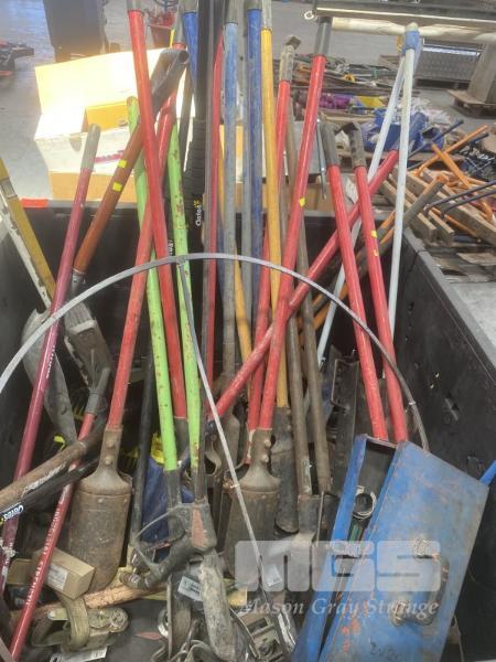 BROOMS, SHOVELS, 6 x POST HOLE SHOVELS, MATICS, ETC