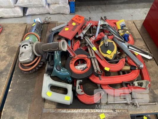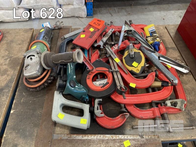 ASSORTED HAND TOOLS INCLUDING 8 x 150mm G-CLAMPS, HEX WRENCH SETS, 2 x SET SQUARES, HACKSAWS, PROTRACTORS & HITACHI G13SE2 ANGLE GRINDER, 125mm, 240V