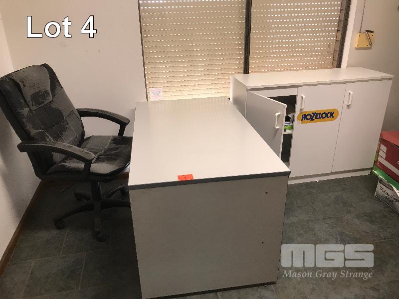 GREY OFFICE DESK, WHITE 3 DOOR STORAGE CABINET & 2 DRAWER STEEL