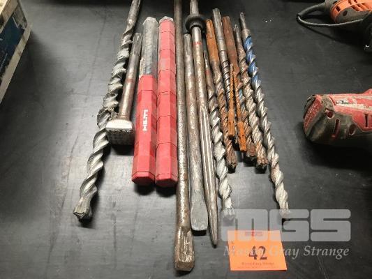 ASSORTED HAMMER DRILL ATTACHMENTS, MASONRY DRILLS, CHIPPING SPADE, SPIKES, ETC