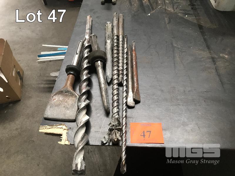 ASSORTED HAMMER DRILL ATTACHMENTS, MASONRY DRILLS, CHIPPING SPADE, SPIKES, ETC