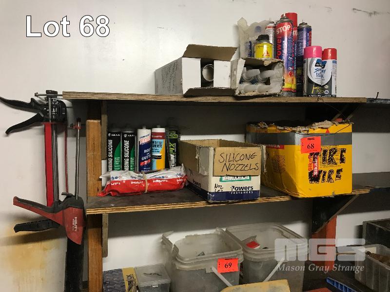 ASSORTED SILICONES, EXPANDING FOAM, DYE MARK PAINT, TIE WIRE, CAULKING GUN, ETC