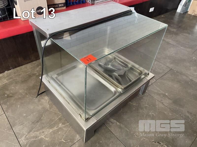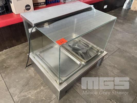 BENCHTOP BAIN MARIE, SHARPLINE WET BASE WITH WARMING LIGHT STAINLESS STEEL CASED 240V 84 (W) x 64cm (D) 1 x SIDE GLASS PANEL MISSING