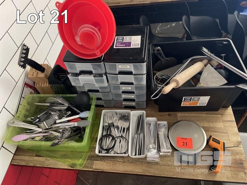 QUANTITY KITCHEN UTENSILS, CUTLERY, SCALES, DIGITAL INFRARED THERMOMETER, ETC