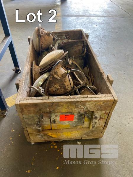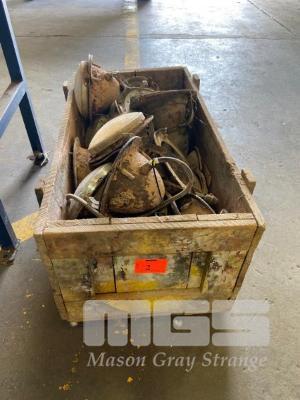 TIMBER CRATE OF EARLY CAR HEADLIGHTS & BUCKETS