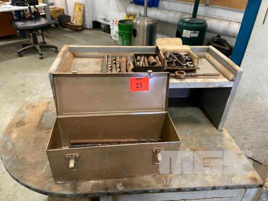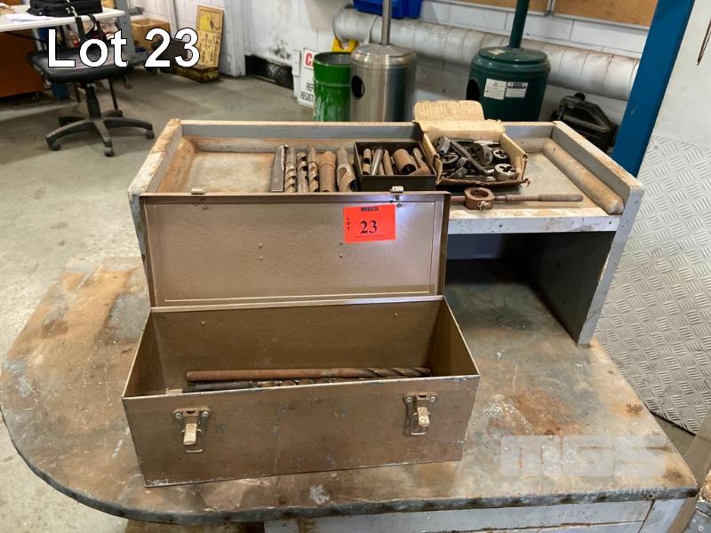 MIXED LOT TOOL BOX & CONTENTS WAD PUNCHES, TAPS & DIES DRILL BITS, STEEL & TIMBER