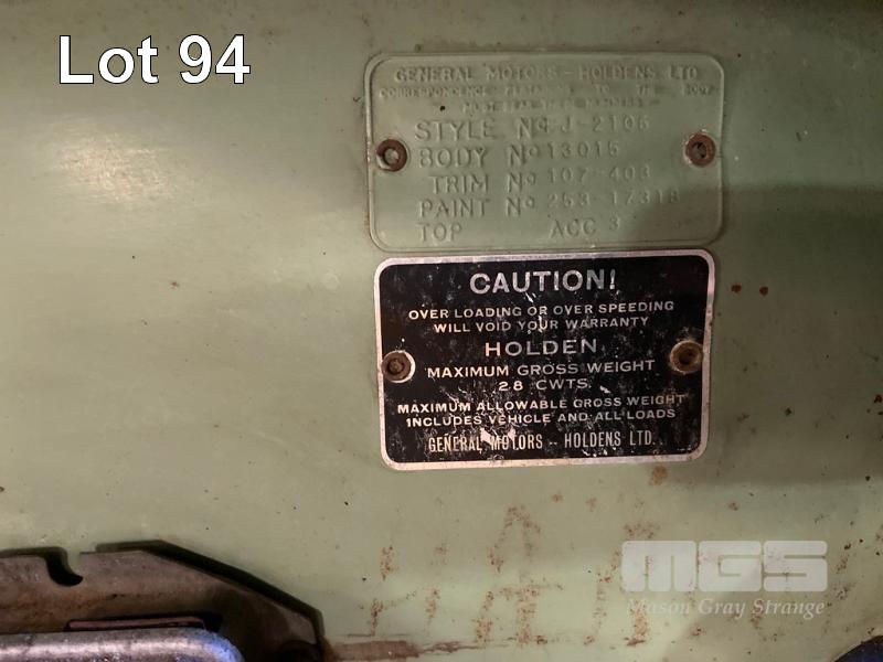 FJ HOLDEN UTE CIRCA 1955 ODO: 82,987miles SHOWING REG: XLV888 STYLE: FJ-2105 BODY No: 13015 6 CYLINDER MANUAL GEARBOX WITH OWNERS HAND BOOK & MANUAL , RADIO. TOW BAR & ASSORTED SPARES . EXCELLENT REAR SOFT COVER. RESPRAYED IN EXCELLENT RUNNING CONDITION