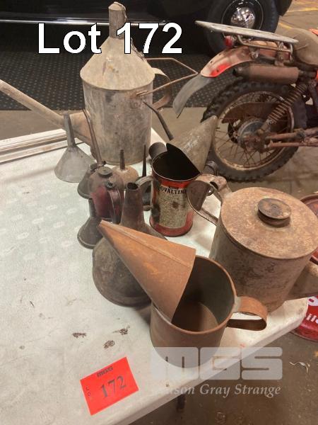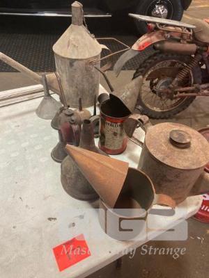 13 x ASSORTED EARLY SPIRITS, OIL FUNNELS & FILLER CAN