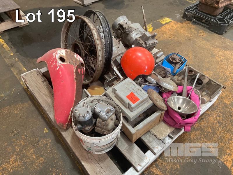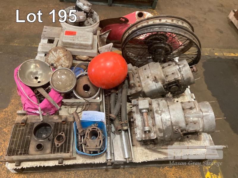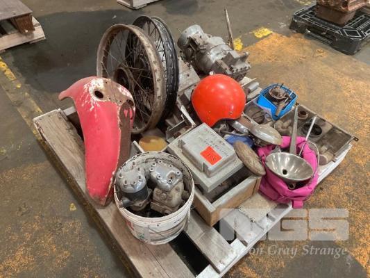 PALLET LOT OF VELOCETTE LE PARTS 2 X ENGINES WITH GEARBOXES 2 X WHEELS RADIATOR, LIGHTS, FENDER, ETC.