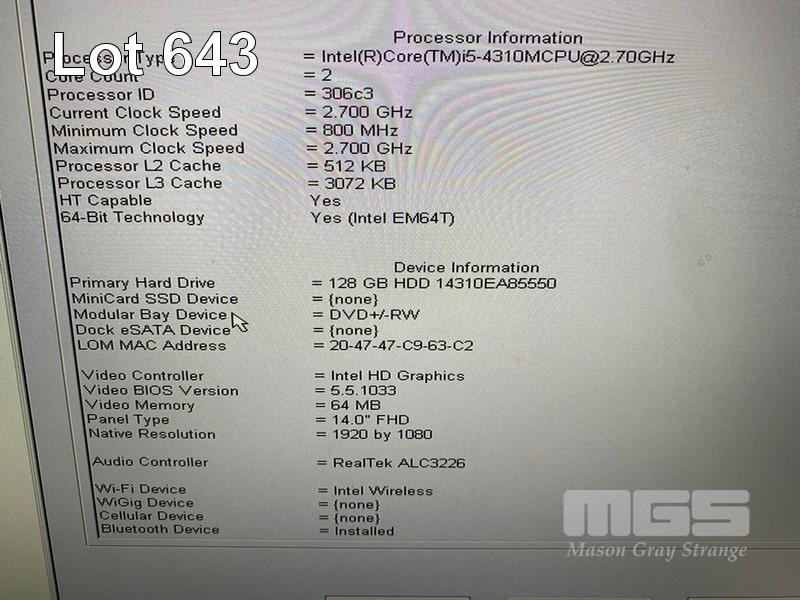 LAPTOP, DELL LATITUDE E6440, CORE i5 4310M (4TH GEN) @ 2.7GHz, 8GB DDR3 RAM, 128GB SSD, DVD-RW, 14" WIDESCREEN (1920x1080), INTEL HD VIDEO, Wi-Fi, BLUETOOTH, WINDOWS 10 PRO INSTALLED & POWER SUPPLY S/N:GL6MZ52