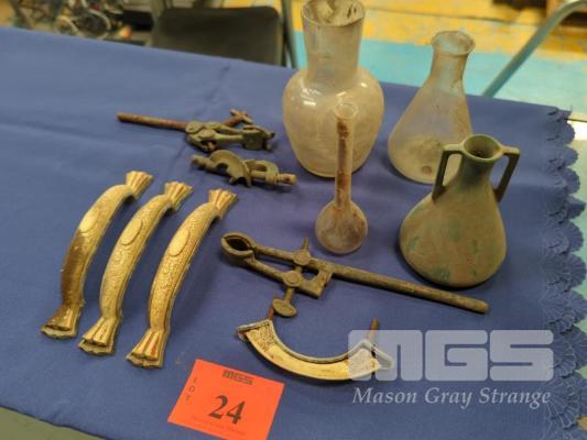 VINTAGE SCIENTIFIC EQUIPMENT, BEAKERS, ROD HOLDERS WITH ASSORTED COLLECTABLES