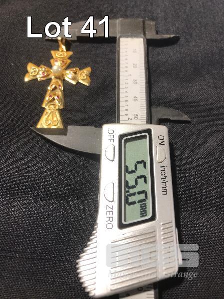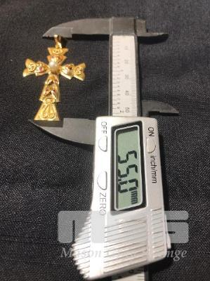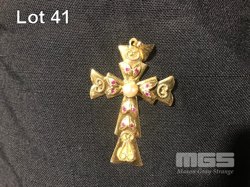 GOLD CRUCIFIX, MARKED 750 (18ct) SET WITH PINK GARNETS & PEARL. 7.4 gms