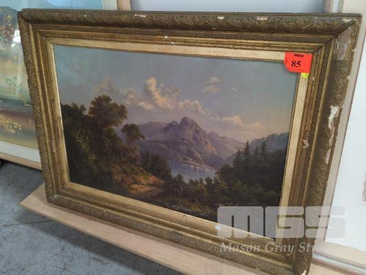 FRAMED OIL ON CANVAS PAINTING MOUNTAIN & LAKE SCENE, DAMAGE TO CANVAS & FRAME