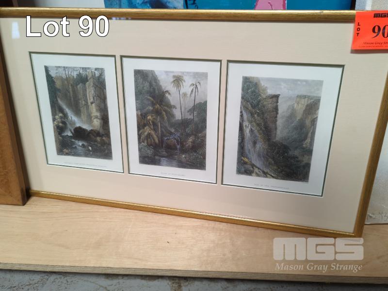 SET 3 FRAMED LITHOGRAPHS, PRINTS DEPICTING CATARACT GLEN MOUNT WELLINGTON, TASMANIA, GULLY @ WOLLONGONG & FALL OF THE WEATHERBOARD BY S. PROUT