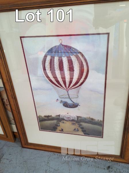 4 x FRAMED ARTISTIC HOT AIR BALLOON PRINTS, 2 x TWIN PANEL & 2 x SINGLE PANEL INC BALLOON IN USA COLOURS OVER THE WHITEHOUSE FLYING THE US FLAG (IRONIC), SIGNED