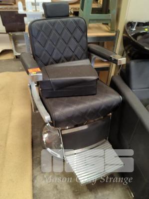 BARBERS CHAIR, BLACK VINYL UPHOLSTERED, CHROME FOOT STAND, HAND PUMP, GAS LIFT & MATCHING FOAM RAISER